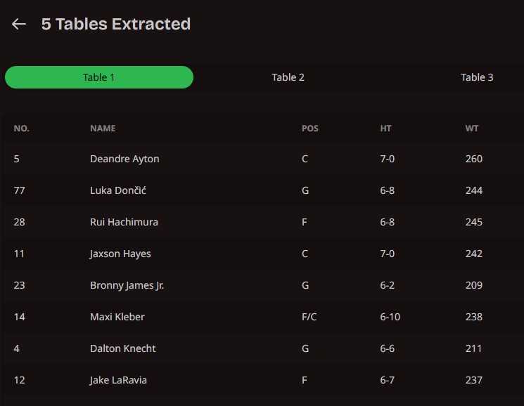 Luego de unos minutos trabajando la página te mostrará el resultado. En este ejemplo extraje datos de un PDF de estadísticas de Los Ángeles Lakers de la NBA: